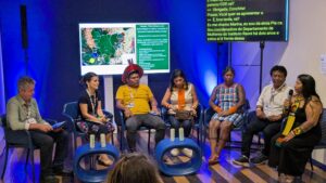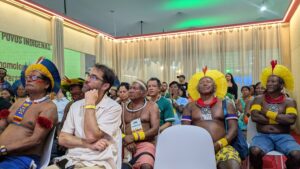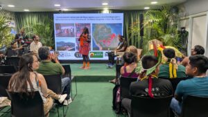 The second event, entitled Strengthening the institutional capacity of local organizations as a strategy to address the climate crisis in Indigenous territories: the case of the Kayapó took place in the state of Pará’s Secretariat of Environment, Climate and Sustainability Pavilion. During this event, Kayapo organization shared initiatives for territorial and cultural protection, including territorial surveillance and monitoring; development of sustainable economic alternatives like Brazil nuts and ecotourism; and institutional strengthening and the empowerment of Kayapó women. The event was moderated by Dr. Adriano Jerozolimski, Kayapo Project Director, Brazil.