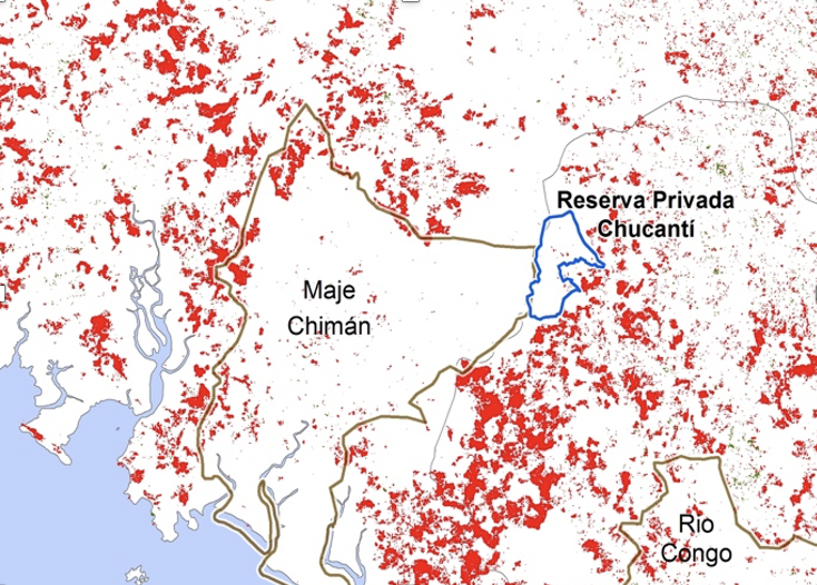 Outside Wounaan territories, forests are being logged and cleared for cattle ranching and farming at one of the highest rates in Panama and there has been widespreaddestruction of coastal mangroves. With access from the Pan American Highway, settlers have cleared 40% of the land in eastern Panama. The remaining forest – starkly seen from satellite imagery – is found in national parks and Indigenous territories, including Indigenous territories still without legal recognition like Rio Hondo, Platanares and Majé.